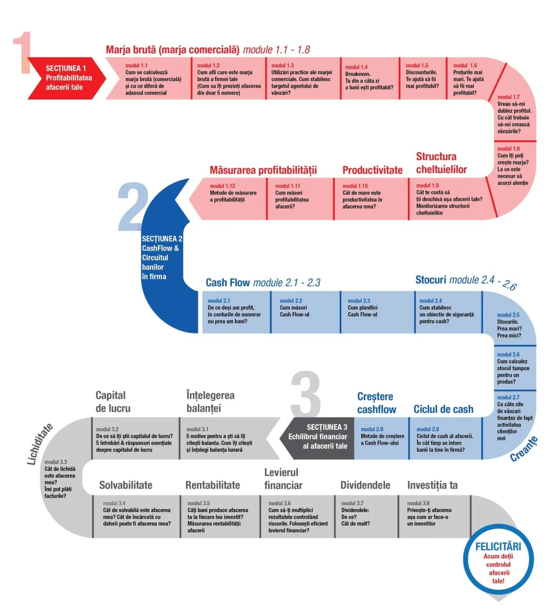 Această călătorie poate fi parcursă la voia întâmplării, cu speranța că norocul te va duce către capătul drumului, sau poate fi pacursă în mod asumat și informat atingând cele 3 jaloane importante descrise în curs: stăpânirea unei profitabilități repetitive și sustenabile, controlul cashflow-ului și echilibrarea financiară a afacerii.